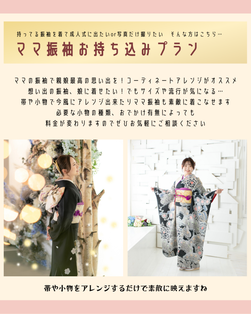 ママ振袖のアレンジにも対応してくれるから、世代を超えた絆を感じることもできます。