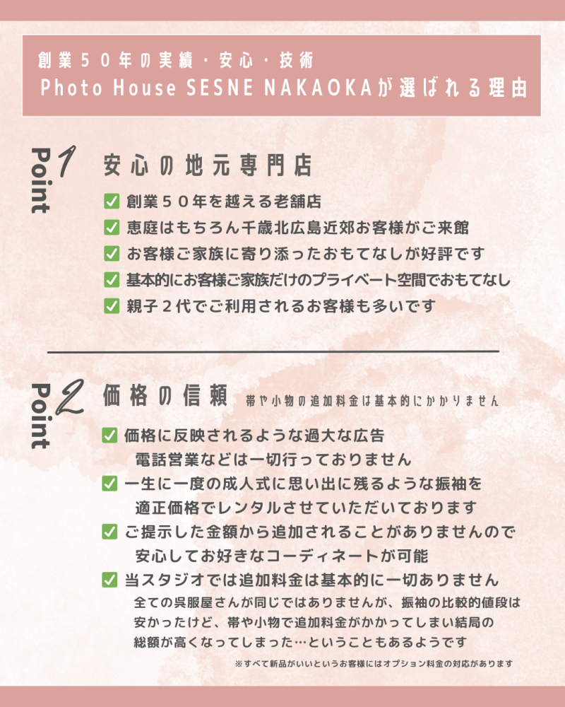 創業51年の実績、年間100組を超える成人式関連撮影、Google口コミ平均4.8点という信頼性。