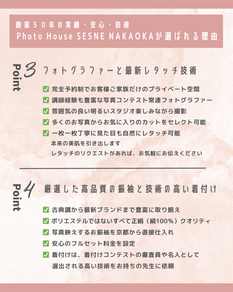 Photo House SENSE NAKAOKAでは、創業51年という長い実績があって、Googleの口コミも平均4.8点という高評価。