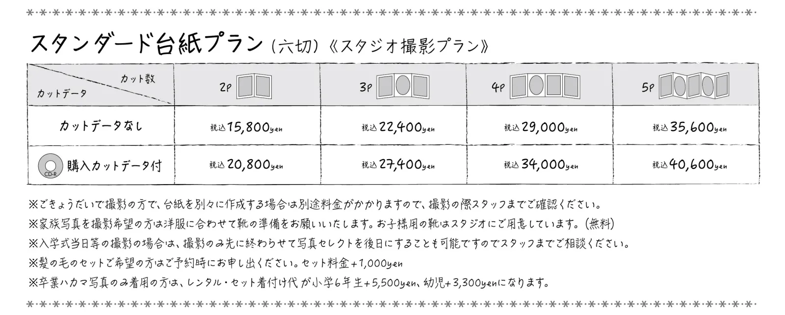 撮影後、約1か月半でお写真が仕上がります。(商品により仕上がりが前後します。)特急仕上げ希望の方はプラス3000円で承ります。